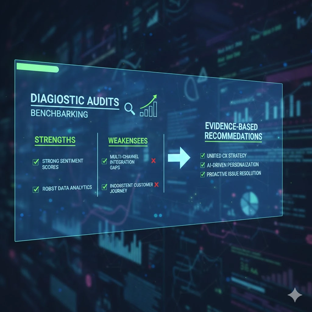 Audits benchmark against industry standards, highlighting strengths like strong sentiment scores or weaknesses in multi-channel integration. This foundation enables precise, evidence-based recommendations.