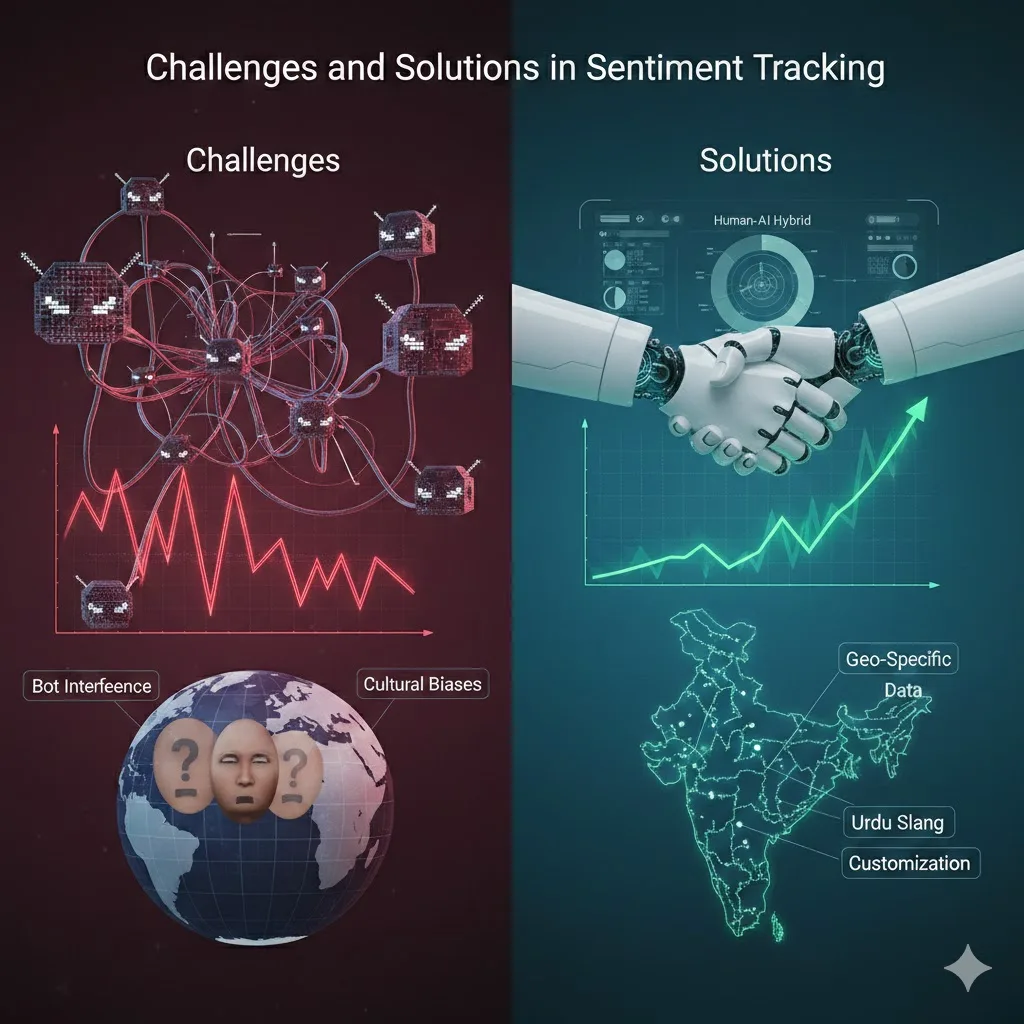 Challenges include bot interference skewing metrics and cultural biases in language models.