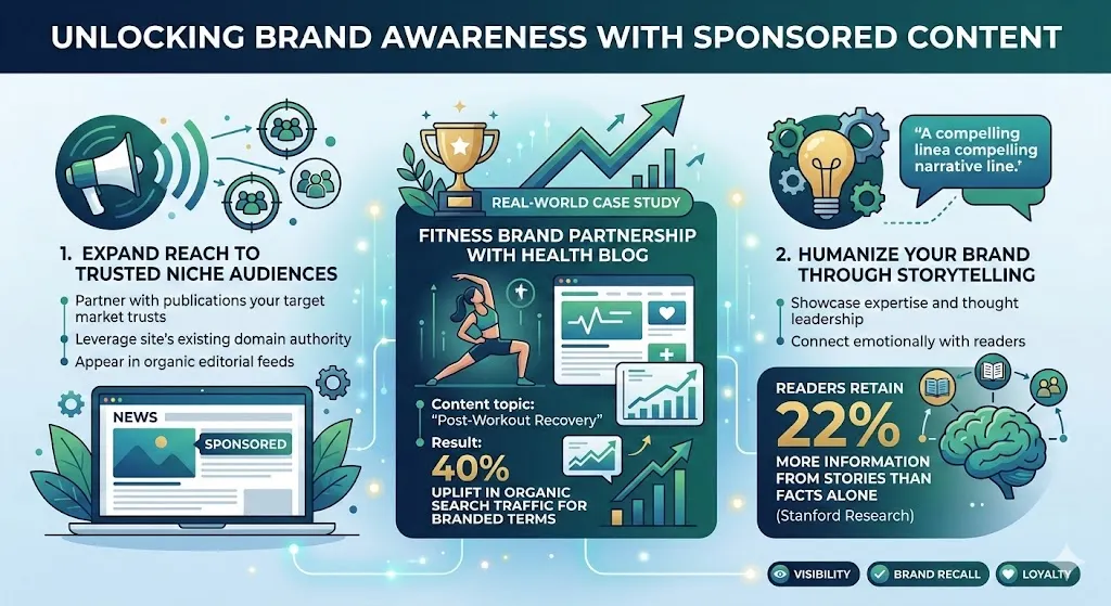 Additionally, these articles humanize your brand, showcasing expertise through storytelling. Readers retain 22% more information from stories than facts alone, per Stanford research, making sponsored content ideal for visibility that converts to recall and loyalty.