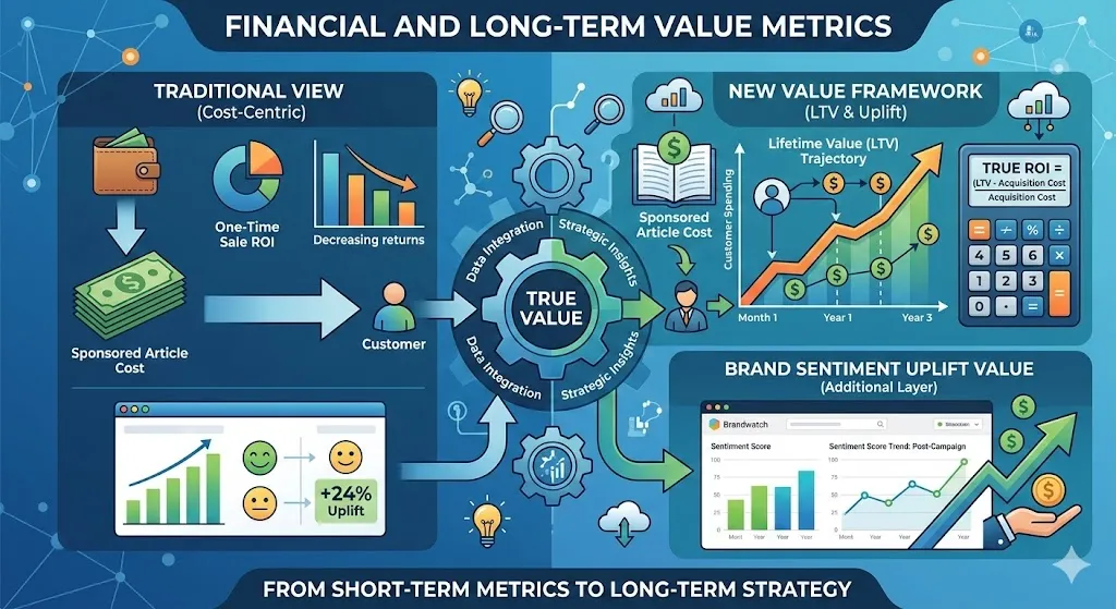 Lifetime value (LTV) multiplies one-time sales for true ROI. Compare sponsored article costs against LTV of acquired customers. Brand sentiment scores from tools like Brandwatch add uplift value.