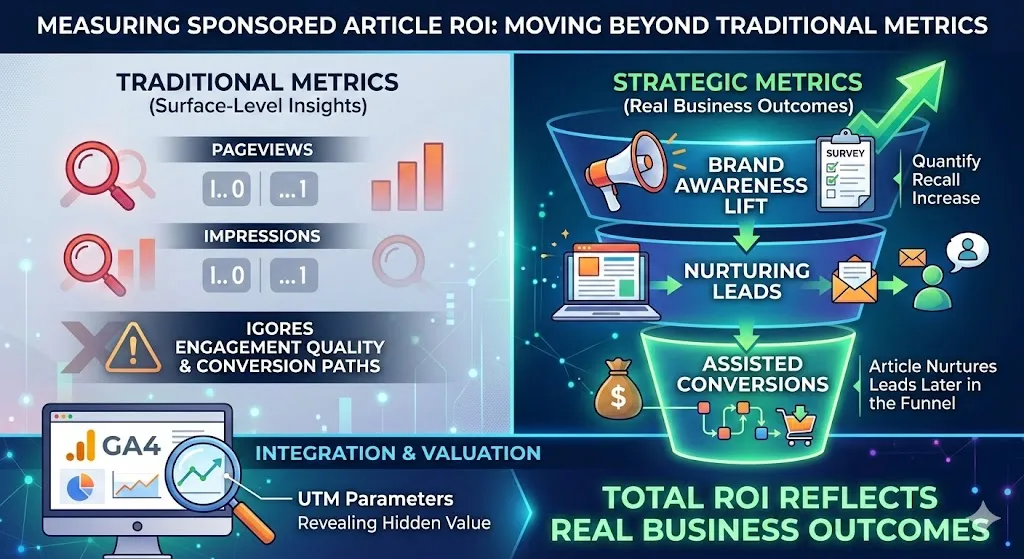 Pageviews and impressions offer surface-level insights but ignore engagement quality or conversion paths. For accurate ROI of sponsored articles for your brand, prioritize metrics like assisted conversions, where the article nurtures leads later in the funnel. Tools like Google Analytics 4 integrate UTM parameters to track this, revealing hidden value.